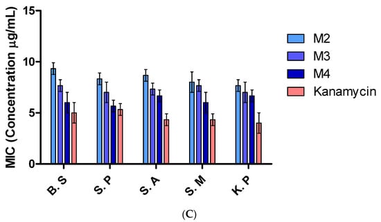 The turbidometric assay was employed to present the inhibitory effects of samples M1, M2, M3, and M4 against each bacterial strain. Standard kanamycin was used as a positive control. Every step of the Clinical and Laboratory Standards Institute (CLSI) broth microdilution protocol was adhered to []. A sterile 96 micro-titer plate was utilized for the assay for each bacterial culture. The negative control had no bacteria on it, while the positive control had kanamycin. The test samples M1–M4 were placed into the first well and then diluted twice more until they reached the seventeenth well; the last well was devoid of both germs and drugs (negative control). After that, 5 μL of a diluted bacterial suspension (1.5 × 106 cells/mL) was added to each well (except from the negative control) and thoroughly mixed. Microdilution was carried out in triplicate for every kind of bacterial species. Following an overnight incubation at 37 °C, growth was seen. The lowest concentration prior to turbidity was recorded as the MIC.