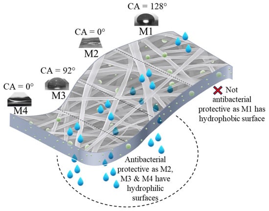 For both indoor and outdoor activities, breathability and water resistance are crucial. Nanofiber (NF) fabrics effectively wick moisture away from the skin, benefiting disabled individuals, babies, and older people, who might have difficulty with personal care duties because of trembling or poor muscle control. The selection of materials is vital, especially for protective clothes, such as nappies or bibs, to prevent staining from food and drink spills, which can irritate the skin and are challenging to remove. Membrane hydrophilicity is a crucial requirement for the effective use of nanofibrous membranes in fabrics. In the field of bio-medicated textiles that fight bacteria, water-loving surfaces promote interaction between cells and the membrane interface. Similarly, for optimal antibacterial performance, hydrophilic surfaces improve the membrane’s antimicrobial properties by permitting aqueous solutions to wet and subsequently infiltrate the fabrics. However, PLA, a hydrophobic polymer with a contact angle exceeding 120°, needs modification or functionalization to enhance its wettability (reducing the contact angle to below 90°) while maintaining water stability.