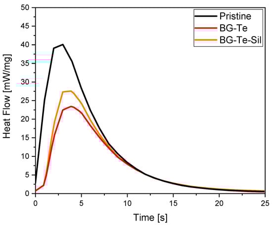 Heat flow of the photocurable pristine, BG-Te, and BG-Te-Sil formulations.