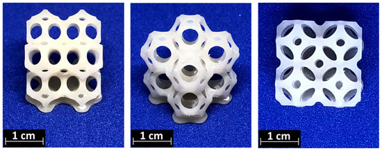 After evaluating the suitable viscosity for printability, 3D-printing parameters were defined for all the investigated formulations, which corresponded to 120 s for the first layer and 5 s for the subsequent layers. On the basis of these parameters, all the formulations were 3D-printed. Both DMTA rectangular specimens, as well as 3D-complex structures, were achieved using 3D printing for both pristine and filled formulations. In Figure 5, an example of a complex shape obtained with BG-Te is reported.