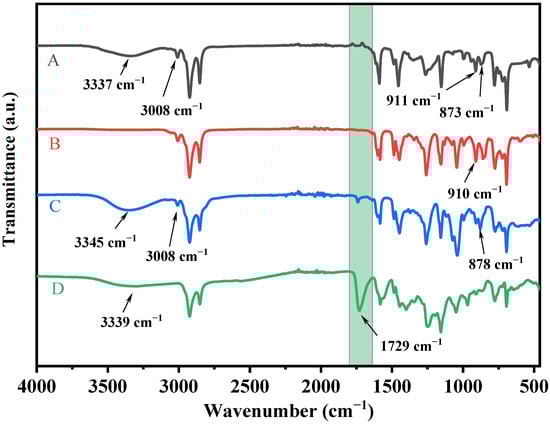 The chemical structures of the products were determined using Fourier transform infrared spectroscopy (FTIR) and 1H nuclear magnetic resonance (NMR). FTIR was performed using a Thermo Scientific Nicolet iS10 spectrometer (Waltham, MA, USA), covering a wavenumber range of 600–4000 cm−1. The 1H NMR spectra were recorded on a Bruker 400 MHz spectrometer (Billerica, MA, USA), employing deuterochloroform (CDCl3) as the solvent and tetramethylsilane (TMS) as the internal standard.