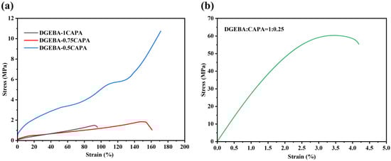 Stress–strain curves from tensile test. (a) DGEBA-1CAPA, DGEBA-0.75CAPA, DGEBA-0.5CAPA (b) DGEBA-0.25CAPA.