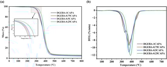 The thermal stability of the cured samples was tested via thermal gravimetric analysis (TGA) thermograms (Figure 3), and all relevant parameters were listed in Table 2. The thermal decomposition temperature of the cured epoxy vitrimers was distributed at 300–350 °C. Clearly, the vitrimers cured by cardanol derivatives exhibited excellent thermal stability, and their initial pyrolysis temperature (Ti%) was up to 349.7 °C. As the proportion of CAPA fraction increases, the thermal decomposition temperature of the epoxy vitrimers tends to fall. Owing to the increase in ester bonds, and the decomposition range of 300–450 °C is attributed to the breakage of the ester bond segment in the epoxy vitrimer structure, resulting in a decrease in thermal stability. The derivative thermogravimetry (DTG) curve shows two peaks in DGEBA-1CAPA: the peak at 330 °C represents the decomposition process of CAP without double bond structure, and the peak at 374.2 °C stands for the maximum degradation rate of normal epoxy vitrimers. Notably, the thermal stability of the vitrimers prepared here is higher than many reported vegetable oil-based epoxy thermosetting resins [11,41,42], which may be ascribed to the high-temperature resistance of the benzene ring structure of cardanol [32].
