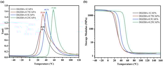 The microstructures of these materials were further investigated using dynamic mechanical analysis (DMA) to ascertain their dynamic mechanical properties. Figure 4 shows tan δ as a function of temperature for the resulting vitrimers. Among all components, DGEBA-0.25CAPA exhibited the highest Tg (measured from the peak temperature of tan δ) ~57.8 °C. The Tg value of the cross-linked polymer is affected by the stiffness of the skeleton and the cross-linking density. Excessive DGEBA provides a more rigid benzene ring structure for the cross-linked network, which hinders the movement of the molecular chain, so DGEBA-0.25CAPA exhibits the highest Tg. The Tg value of DGEBA-1CAPA is instead the lowest, mainly because more flexible chain structures of CAPA make the molecular chains move more easily.