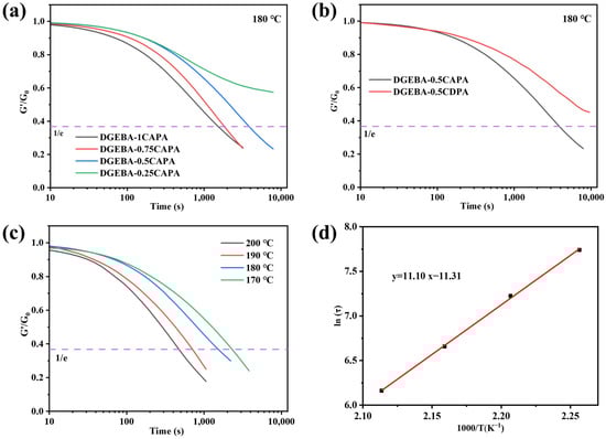 The cross-linked network was rebuilt by thermally inducing DTERs in the network structure of epoxy vitrimers, which caused a stress relaxation behavior. According to the Maxwell model of relaxation response theory, the time at which the modulus relaxes to 1/e of the initial modulus, is considered the relaxation time (τ*) of vitrimers. Figure 5a shows the stress relaxation performance at different ratios of DGEBA-CAPA at 180 °C. Clearly, the stress relaxation time is prolonged as the content of CAPA gradually decreases. The relaxation time of DGEBA-1CAPA is as short as 1530 s, while the relaxation time of DGEBA-0.25CAPA is longer at 180 °C.