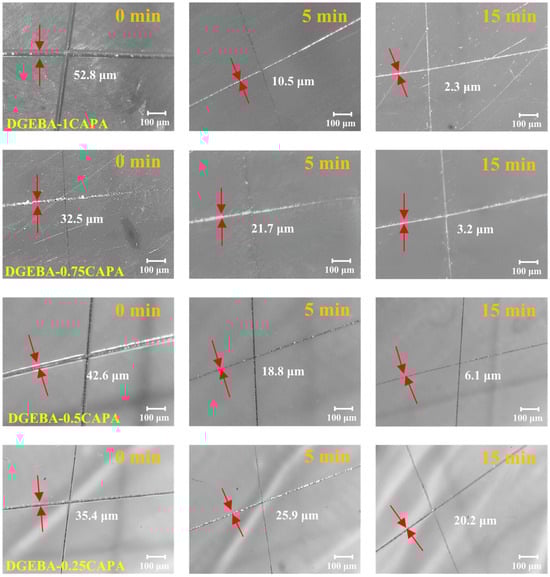 The cross-linked network induced by dynamic transesterification endows the vitrimers with self-healing properties. To evaluate this performance, the procedure was as follows: scratch a glass body with a smooth surface with a scalpel, and then heat it in an oven at 180 °C for different times to complete the thermally induced self-repair test, and record the size of the scratches at different repair times. Define the percentage of the repaired scratch to the original scratch size as the self-healing efficiency under this condition. Figure 6 shows the crack healing images heated at 180 °C for different time periods. DGEBA-1CAPA exhibited the best repair performance, and the cracks were almost completely recovered within 15 min. This is because the cross-linked networks of DGEBA-1CAPA contain abundant ester bonds, hydroxyl groups and tertiary amine structures, which can be reconstructed in the networks of vitrimers by DTERs at high temperatures. DGEBA-0.25CAPA exhibited the slowest self-healing rate, recovering to 42.9% of the crack width after 15 min, which is consistent with its slow stress relaxation rate. For comparison, due to the absence of hydroxyl groups and tertiary amine structures in CDPA, the rate of DTERs is relatively slow. After heating at 180 °C for 15 min, the crack width was only restored by 41.1%, which is much lower than that of DGEBA-1CAPA (Figure S10).