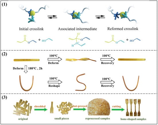 (1) Schematic of the remolding mechanism based on transesterification exchange reaction; (2) Schematic diagram of shape memory properties of DGEBA-CAPA; (3) Schematic diagram of reprocessing process.