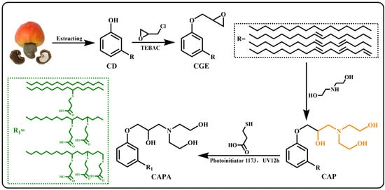 Cardanol (CD, Shanghai Meidong Biomaterials Co., Ltd., Shanghai, China) was purified by vacuum distillation at 240 °C. Diglycidyl ether of bisphenol A (DGEBA, epoxide value: 0.51 mol·(100 g)−1) was obtained from Nantong Xingchen Synthetic Materials Co., Ltd. (Nantong, China). 3-mercaptopropionic acid (MPA), 2-Hydroxy-2-methyl-1-phenyl-1-propanone (photo initiator 1173) were purchased from Shanghai Macklin Biochemical Co., Ltd. (Shanghai, China). Epichlorohydrin (ECH), Diethanolamine (DEA), benzyl-triethylammonium chloride (TEBAC), 2,4,6-tris (diethylaminomethyl) phenol (DMP-30) were purchased from Shanghai Aladdin Bio-Chem Technology Co., Ltd. (Shanghai, China).