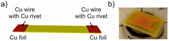 (a) Schematic view of a substrate with electrodes for measuring the dependence of GNPs composite electrical conductivity on filler concentration; (b) a photograph of an IDE substrate for VOC sensors.