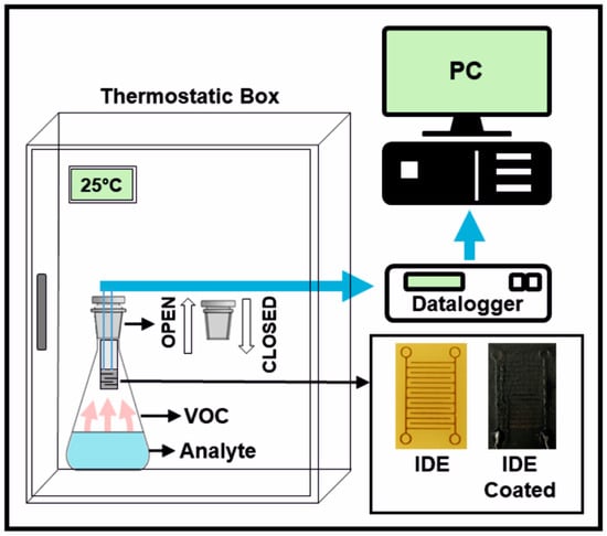 Experimental system for measuring the resistance change response to saturated vapours of the tested VOCs.