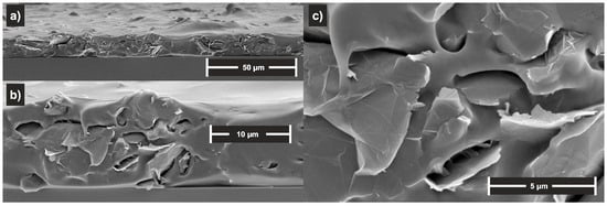 The SBS polymer matrix was chosen because of its solubility, solution processability in toluene, and its ability to form elastic material consisting of two separated phases formed from the polystyrene and polybutadiene rubber blocks. GNPs were readily dispersed in SBS solution and spin cast immediately from freshly prepared dispersions. Figure 3 shows the cross-section morphology of the prepared nanocomposite as observed by SEM on the freeze-fractured sample. SEM and TEM images of GNPs are given in the Supplementary Material in Figures S1 and S2. A relatively good, although imperfect, dispersion and distribution of the GNPs filler in the SBS matrix is visible, and filler particles seem randomly oriented. The thickness corresponds with the profilometric measurements.