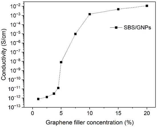 The resistivity of SBS/GNPs films with various filler concentrations was investigated to find a suitable concentration for preparing the active layer in the proposed sensors. The percolation curve is depicted in Figure 5. The electrical conductivity of the SBS/GNPs follows the percolation theory, indicating a percolation threshold []. The mechanism governing the percolation behaviour of SBS/GNPs is expected to be similar to carbon nanotube-filled composites []. The biggest jump by eight orders in conductivity is between 4.5% and 10%, indicating the threshold at 5% when large clusters begin to be formed and the tunnelling effect between GNPs is manifested. Above 10%, the GNPs network is formed, and a further increase in concentration only densifies its structure, manifested in incremental conductivity enhancement and following stabilisation.