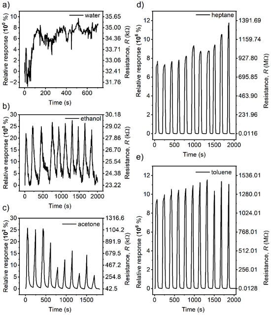 The sensors were tested against vapours of water, ethanol, acetone, toluene, and heptane for ten on/off cycles as plotted in Figure 6.