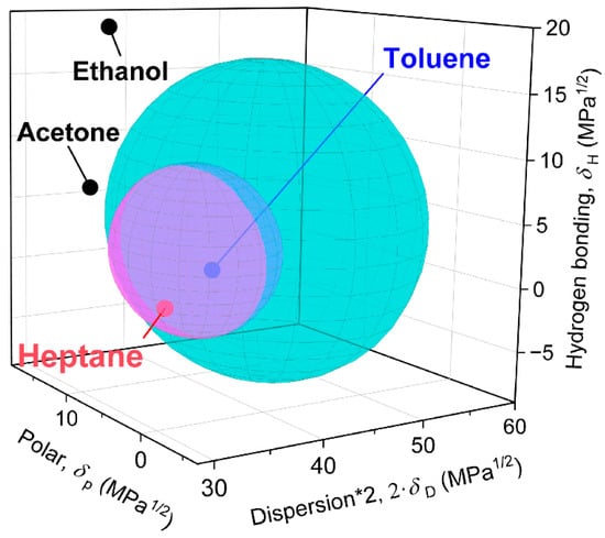 The HSP plot in Figure 7 offers a much more understandable picture, as it visualises the numbers in their geometrical meaning using the main advantage of the HSP approach. There are two solubility spheres, the larger in cyan, corresponding to PS with r0 value of 12.7 MPa1/2, and the smaller in magenta, corresponding to PB with r0 value of 6.5 MPa1/2.