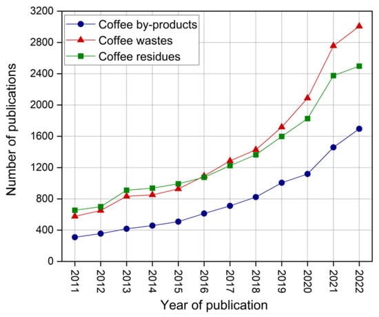 Due to the high production of coffee worldwide and high consumption of coffee beverages, large amounts of waste are generated from the coffee processing industry, and this waste requires proper disposal or reuse. Figure 1 shows the number of publications from 2011 to 2022 identified in the bibliometric study. The Scopus database was employed to search for the following keywords: coffee by-products, coffee wastes, and coffee residues. It is possible to observe an upward trend in the number of publications related to by-products, wastes, and residues from the coffee industry. However, the total number of annual publications is still relatively low, indicating a great opportunity for innovation in this area.