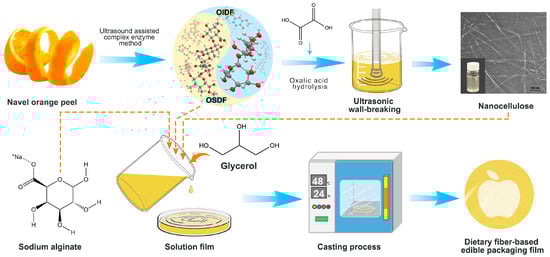 In this study, navel orange soluble dietary fiber (OSDF) and navel orange insoluble dietary fiber (OIDF) extracted from navel orange peel pomace (OP) were used for the first time to prepare a green and biodegradable edible packaging film. This not only added nutritious value to food packaging but also offered a cutting-edge method for the sustainable use of fruit waste. The specific substrates utilized were OSDF and sodium alginate (SA), and the filler used was nanocellulose (ONCC), which was prepared from OIDF using an ultrasonic-aided organic acid process. Via simply physical blending, good-performance OSDF/SA/ONCC edible packaging film was prepared. Three methods were employed in a step-by-step process to find the optimal recipe for preparing OSDF/SA/ONCC edible packaging film. The microstructure, chemical content, and thermal properties of the OSDF/SA/ONCC edible packaging films were analyzed using SEM, TEM, XRD, and TGA techniques. The rheological properties of the edible packaging film solution were analyzed using a rheometer. The findings indicated that the OSDF/SA/ONCC, composed of dietary fiber and containing 4 wt.% ONCC, demonstrated exceptional performance. This study not only maximized the utilization of dietary fiber from navel orange peel pomace in edible packaging films, but it also offered a novel theoretical framework for making edible packaging films.