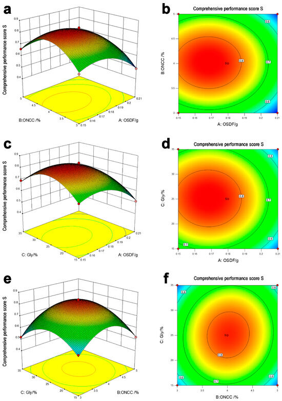 Create a three-dimensional spatial response surface map and contoured map using the response value performance overall score, OSDF addition amount, ONCC quality score, and Gly quality score. Based on the regression equation, predicted the effects of various factors on the performance overall score. Figure 2 shows that the trend of overall performance scores under different factors was essentially consistent, i.e., there was an interaction between the factors and the performance overall scores that showed a trend of first increasing and then decreasing with A, B, and C. The highest point on the graph depicted the maximum value within the selected range. The A was between 0.15 g and 0.18 g, the B was between 3.7% and 4.2%, and the C was between 22% and 27%, which resulted in a high-performance overall score, and the ability to obtain optimum process parameters. This experiment used the software Design Expert 10 to carry out extensive optimization using performance overall classification as the optimization aim. Table S6 showed the results of the optimization. When A was set at 0.17 g, B at 4%, and C at 25%, the model’s predicted total performance score amounted to 0.843. Based on the optimization results of the previously mentioned factors, validation experiments were conducted, and the results showed that the overall performance score was 0.812, 0.851, and 0.806, with an average overall performance score of 0.826, which was close to the model’s projected value. This shows that the response surface model-based method of complete performance score analysis and optimization is efficient and practical.