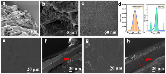 SEM micrographs of OP (a) and OIDF (b); (c) TEM image; (d) Particle size distribution and Zeta potential of ONCC; Surface (e) and cross-section (f) SEM images of OSDF/SA; Surface (g) and cross-section (h) SEM images of OSDF/SA/GNCC.