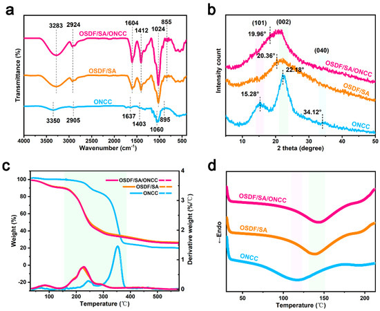 Figure 4a showed the findings of an investigation into the interactions between the elements of edible packaging film. The ONCC showed the typical cellulose I absorption bands at 3350 cm−1, 2905 cm−1, and 1637 cm−1 [30]. The absorption maxima at 1430 cm−1 and 1060 cm−1, respectively, were caused by the vibrational absorption of the C-H bond bending and alcohol hydroxyl C-O stretching in cellulose molecules. At 895 cm−1, they were brought on by the hetero-cephalic vibration of the glycosidic bond group, which corresponds to the C-H bond deformation vibration in cellulose [31]. The OH...O stretching vibration of the O-H group and hydrogen bond, as well as the symmetric stretching vibration absorption peak of the C-H bond in methylene, were the absorption peaks of the OSDF/SA edible packaging film at 3283 cm−1 and 2924 cm−1 [32], respectively. The asymmetric and symmetric stretching vibrations of the carboxylate group were responsible for the absorption peaks at 1604 cm−1 and 1412 cm−1 [33], respectively. The C-O-C stretching vibration was responsible for the absorption peak at 1024 cm−1, whereas the C-H bond’s bending vibration was responsible for the absorption peak at 855 cm−1. There were no new peaks in the FTIR spectrum of the OSDF/SA/ONCC edible film when compared to the FTIR spectrum of the OSDF/SA edible packaging film, showing that there was no chemical interaction during the creation of the film between OSDF, SA, and ONCC. The ONCC contained a lot of hydroxyl groups that caused the O-H group peak strength in the edible packaging film of OSDF/SA/ONCC to increase, suggesting that covalent or hydrogen bonds were forming between the molecules of the edible film [34]. However, no new absorption peak was produced, further demonstrating the compatibility of ONCC and OSDF.