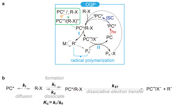 (a) Typical catalytic cycle for organocatalysed atom transfer radical polymerisation (O-ATRP) [19,23,24,25]. OQP: oxidative quenching pathway; I: activation; II: deactivation; ISC: intersystem crossing. (b) General processes of the activation step. : rate constant for the formation of PC*/R−X through a diffusion-driven encounter between PC* and R−X; : rate constant for the dissociation of PC*/R−X; : PC*/R−X formation/dissociation equilibrium constant for PC* + R−X ↔ PC*/R−X; : dissociative electron transfer rate constant.
