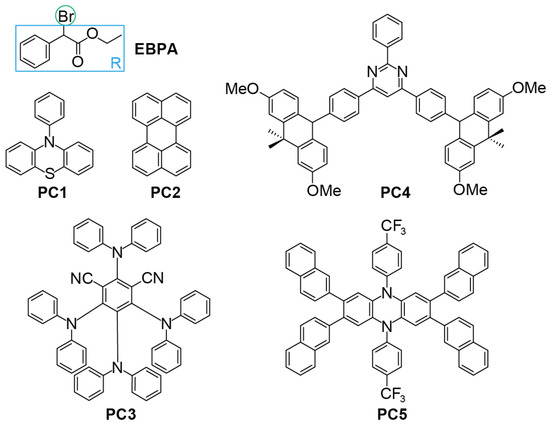 Chemical structures of the initiator (EBPA) and catalysts (PC1–5) in this study.
