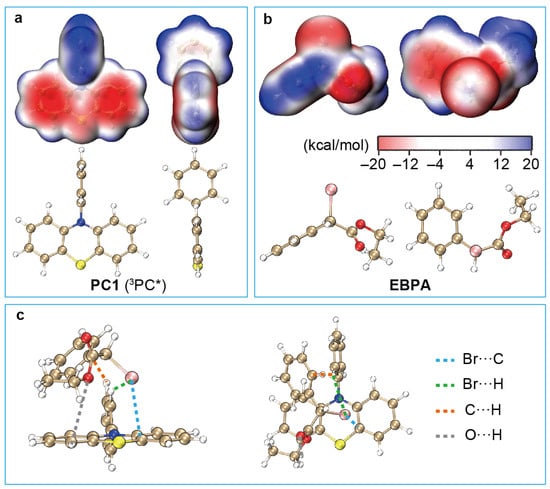 ESPs on the molecular surfaces of the -state PC1 (a) and the ground-state EBPA (b) at UPBE0/def2-SVP/SMD-DMF. (c) Geometry of the exciplex 3PC*/R−X with PC1 as the catalyst and EBPA as the initiator optimised [57] with UPBE0-D3BJ/def2-SVP/SMD-DMF.