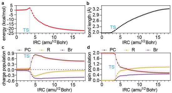 (a) Energy profile along the IRC of the PC1 activation reaction calculated by LOSC-UPBE0-D3BJ/def2-SVP/SMD-DMF. (b) Variation of the C−Br bond length. (c,d) Variation of the Mulliken charge (c) and spin (d) populations. TS: transition structure.