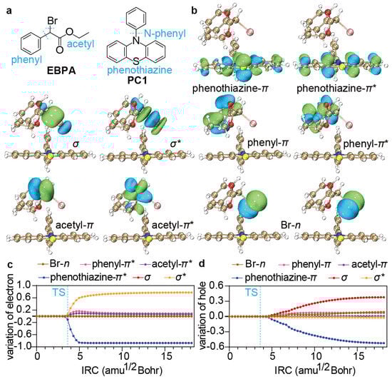 To see the contributions of individual orbitals to the above electron/hole transfer, we take the ground state () of PC/R−X but at the equilibrium geometry of 3PC*/R−X as the reference, whose FLMOs [71] can be constructed noniteratively in terms of the orthonormal primitive FLMOs from subsystem calculations [38,39] (phenyl, Br, and acetyl for EBPA and N-phenyl and phenothiazine for PC1; see Figure 5a) by using the BDF program package [54,56]. Representative reference FLMOs, including phenyl-, acetyl-, , and Br-n for R−X, as well as phenothiazine- for PC, are shown in Figure 5b (see Figures S3 and S4 in the SI for additional FLMOs). The FLMOs at any geometry can also be constructed in the same way. The occupied spin orbitals of 3PC*/R−X are then expanded in terms of the reference FLMOs with the coefficients such that the total number () of electrons of spin can be written as , with . The variation of with respect to reflects the change in the -spin occupation number (ranging between 0∼1) of as compared to that at the equilibrium geometry of 3PC*/R−X. Since the excited electron of 3PC* is associated with -spin, will reveal the amount of transfer of the excited electron. Similarly, is a good indicator of the hole transfer since the hole has -spin. It is then clear that the electron transfer takes place predominantly from phenothiazine- to in the vicinity of the TS (see Figure 5c), after the peak of which a half-hole transfer occurs from phenothiazine- mostly to (see Figure 5d).
