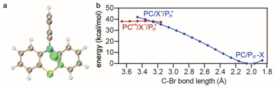 Net Mulliken spin populations of PC·+/X− (a) as well as a relaxed scan of the C−Br bond between the alkyl-C of Pn· and the Br of PC·+/X− (b) using UPBE0-D3BJ/def2-SVP/SMD-DMF.