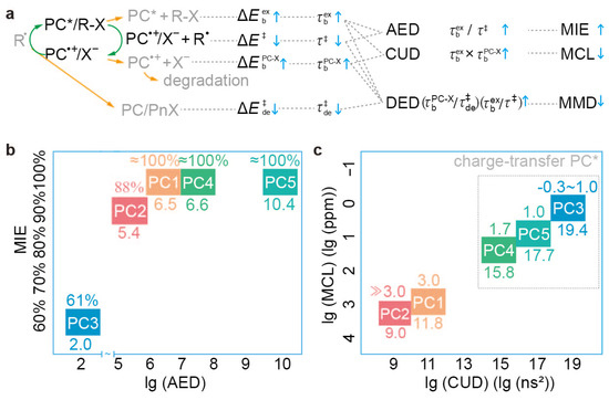 As such, the energy barrier for the dissociative electron transfer 1,3PC*/R−X → PC·+/X− + R· mainly represents the feasibility of the electron transfer process: the lower the , the faster the process. The calculated are documented in Table 1.