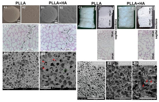 Macroscopical, histological and SEM analyses of PLLA scaffolds without/with HA supplementation. Macroscopical structure of pure PLLA (unilayer: A1,A2, bilayer: C1,C2) and PLLA + HA (unilayer: B1,B2, bilayer: D1,D2) unseeded scaffolds. Hematoxylin–eosin (HE) staining of unseeded pure PLLA (unilayer: A3, bilayer: C3) and PLLA + HA (unilayer: B3, bilayer: D3) scaffolds. (C3,D3): both layers of bilayered PLLA and PLLA + HA scaffolds. Double-headed arrows (A3,B3) indicate interconnectivity. Scanning electron microscopy (SEM) of unseeded pure PLLA (unilayer: A4, bilayer: E1,E2) and PLLA + HA (unilayer: B4, bilayer: E3) scaffold. Scale bars: 1 mm (A1,B1,C1,D1), 100 µm (A3,B3), 250 µm (C3,D3), 1 mm (E1–E3), 200 µm (A4,B4). HA: hydroxyapatite, PLLA: poly-L-lactic acid. Red arrow: HA particles.