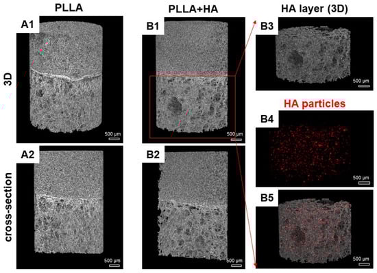 (A,B): Representative microCT images of bilayer scaffolds. Three-dimensional view on pure PLLA and PLLA + HA scaffolds (A1,B1) and cross-sectional views (A2,B2). MicroCT image (3D) of the isolated HA scaffold segment (B3), visualization of the HA particles in the HA segment of the bilayer scaffold (B4, red), merged view of B3 + B4 for localization of the HA particles in the HA layer (B5). HA: hydroxyapatite, PLLA: poly-L-lactic acid. Scale bars: 500 µm.