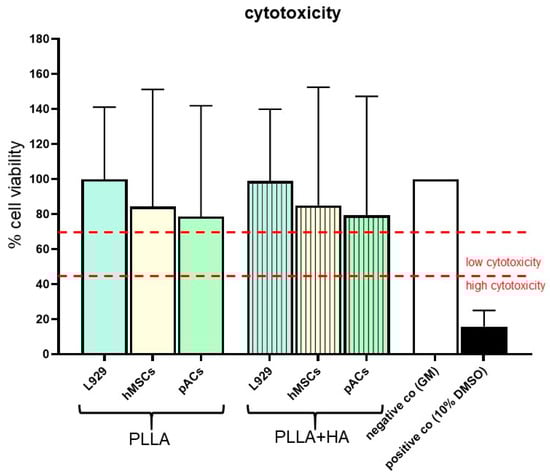 Cytotoxicity of biphasic pure PLLA and PLLA + HA scaffolds was tested. No cytotoxicity could be shown for the extracts of scaffolds without or with HA using the cell line L929, which is generally recommended for cytotoxicity testing. Compared to the growth of the L929 exposed to both extracts, a slight suppression of the vitality of pACs and hMSCs was detectable, which did not exceed the threshold for cytotoxicity at 70% (Figure 3, upper red line).