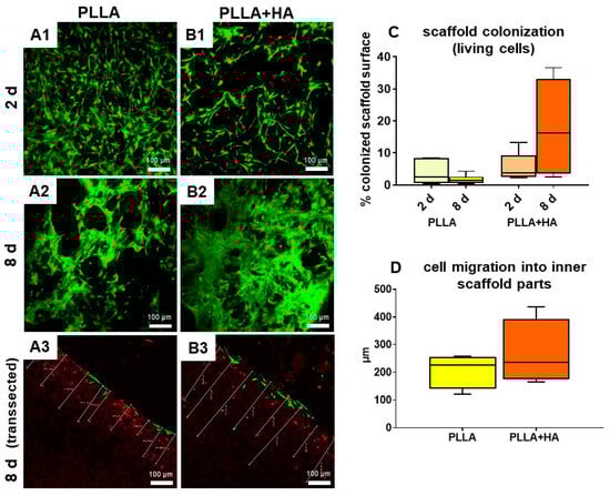 Adherence, survival, colonized surface area on unilayer PLLA scaffolds (100 µm pore size) without/with HA supplementation seeded with undifferentiated hMSCs after 2 and 8 days of statical culture. (A1–A3): PLLA, (B1–B3): PLLA + HA, (A1,B1): 2 days, (A2,A3,B2,B3): 8 days. (A3,B3): A transection through the middle of the scaffold is depicted. The scaffold surface seeded with hMSCs is shown on the upper side. (C): Scaffold surface area colonized with vital cells. (D): Cell migration into inner scaffold parts after one week. HA: hydroxyapatite, PLLA: poly-L-lactic acid. Red: dead cells, green: living cells. Scale bar: 100 µm.