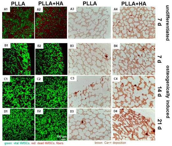 An exemplary long-term experiment with hMSCs cultured on unilayer PLLA and PLLA + HA scaffold variants demonstrated the osteogenic induction of hMSCs after the end of the observation time (21 days): an enhanced Ca++ deposition in scaffolds supplemented with HA, which were kept in osteogenic culture medium, became evident.