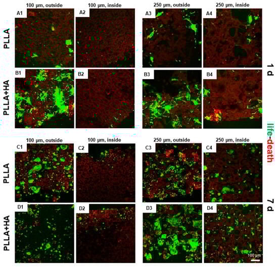 Cell survival on bilayer PLLA scaffolds without/with HA supplementation and seeded with undifferentiated hMSCs/pAC cocultures after cultured dynamically for 1 (A1–B4) and 7 (C1–D4) days. (A1–D1,A2–D2): 100 µm pore size, (A3–D3,A4–D4): 250 µm pore size. PLLA: (A1–A4,C1–C4), PLLA + HA: (B1–B4,D1–D4). HA: hydroxyapatite, PLLA: poly-L-lactic acid. Life–death assay: red: dead cells, green: living cells. Scale bar: 100 µm (representative for A1–D4).