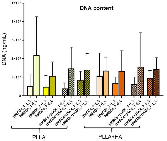 DNA content of hMSC/pAC cocultures and hMSC monocultures on bilayer PLLA scaffolds without/with HA supplementation after cultured dynamically for 1 and 7 days. HA: hydroxyapatite, hMSCs: human mesenchymal stem cells, L: larger pores, pAC: porcine articular chondrocytes, PLLA: poly-L-lactic acid, S: smaller pores. n = 6. Statistical analysis was performed with One-way ANOVA and Tukey’s multiple comparison test.