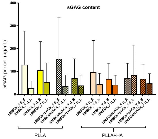 In nearly all analyzed samples except for the PLLA scaffolds seeded with cocultures on the first day, the sGAG content was higher in the scaffold parts with the smaller pore size compared to the layer with larger pores (Figure 8). Nevertheless, the differences between the groups did not reach the significance level (Figure 8).