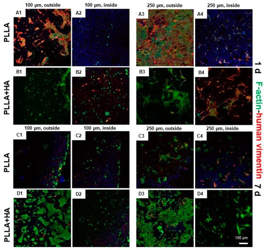 hMSCs were visualized by human-specific vimentin antibodies. To show all cells, this immunolabeling was combined with an F-actin stain, demonstrated by Phalloidin-Alexa488. Cell clusters of hMSCs could be detected on the scaffold surfaces or inside (mostly 250 µm pore size segments), which consisted mostly of elongated cells. All cells exhibited green F-actin fibers. The pACs were smaller than hMSCs and rounded. However, the hMSCs that were visualized by anti-human vimentin could not be exclusively detected on the 250 µm pore-sized scaffold segments but also on the layers with smaller pore sizes (Figure 9). One day after seeding, the inner parts of 100 µm pore-sized scaffold segments showed more exclusively green-stained pACs, and the inner parts of 250 µm pore-sized scaffold segments harbored more red-stained hMSCs. The vimentin staining of hMSCs decreased substantially at 7 days of culturing, especially in PLLA + HA scaffolds (Figure 9).