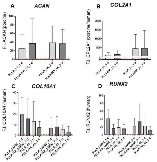 Gene expression analysis of hMSC/pAC cocultures and hMSC monocultures on bilayer PLLA scaffolds without/with HA supplementation after cultured dynamically for 1 and 7 days. (A): porcine aggrecan (ACAN), (B): human and porcine collagen type 2 alpha 1 chain (COL2A1), (C): human collagen type 10 alpha1 chain (COL10A1), (D): human runt-related protein 2 gene (RUNX2). HA: hydroxyapatite, PLLA: poly-L-actic acid. n = 3–5. The red line represents the respective gene expression level of the gene in a monolayer normalized to 1. Statistical analysis was performed with One-way ANOVA and Tukey’s multiple comparison test.