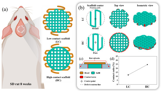For the contact area, which is an independent variable, one scaffold, with a relatively low contact area between the bone defect and the scaffold, was named the LC scaffold, and the other scaffold, with a relatively high contact area between the bone defect and the scaffold, was named the HC scaffold. To briefly explain the design process of each scaffold, as depicted in Figure 1b, the scaffold’s center and the presence of pores or strands influenced the number and length of contact points between the scaffold and the defect site. Therefore, we adopted this in the design, and the LC type was designed with a strand-centered design and the HC type was designed with a pore-centered design.