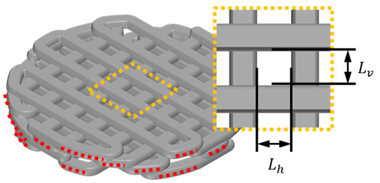 Illustration of essential variables for calculating scaffold contact area and pore size: the red dotted line symbolizes the contact strand length () between the scaffold and the defect, and the yellow dotted line offers an enlarged depiction of the scaffold’s pore. designates the vertical length of the pore, while signifies the horizontal length of the pore.