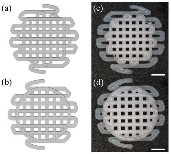 The fabrication fidelity of the AM scaffolds was evaluated based on the defined parameters. To verify that the fabrication was successful in the actual fabrication, the design images were compared with the actual fabricated scaffolds. The PCL scaffolds were successfully fabricated as shown in Figure 3. The fabricated scaffold, as depicted in Figure 3c,d, was skillfully produced to closely resemble the design images in Figure 3a,b both morphologically and without any collapse or distortion in the porous regions.