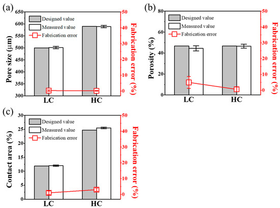 We aimed to evaluate not only the morphological characteristics but also whether the scaffold design variables defined earlier, including pore size, porosity, and contact ratio, were accurately fabricated in a manner consistent with the design values. We aimed to assess the fidelity of fabrication by comparing the measured values of the defined parameters with the design values side by side, and the results are summarized in Figure 4. Detailed design values and measured values for each parameter are summarized in Table 1. As shown in Figure 4a, the designed values and fabrication error rates of the LC scaffold and HC scaffold, both designed with pore sizes of 500 μm and 590 μm, respectively, demonstrated a fabrication precision with an error rate of less than 1%. As depicted in Figure 4b, the porosity, with an error rate of less than 9%, was also confirmed to be precisely fabricated in accordance with the design. The measurement results of the contact ratio between the scaffold and the defect area, as shown in Figure 4c, confirmed that each scaffold was fabricated to be approximately twice the design value, closely resembling the design values.