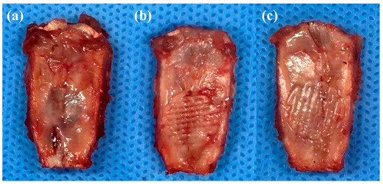 These well-fabricated scaffolds were implanted into the rat calvarial defect, and the rats were sacrificed four weeks later to check the implantation status of the scaffolds. After four weeks, no delamination or hematoma was found in any of the rats, as shown in Figure 5. As shown in Figure 5b,c, each type of scaffold was well integrated with the surrounding tissue and covered with fibrous tissue.