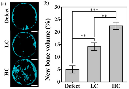 For quantitative analysis of the tissue images, the volume of the newly created 3D model was calculated. As shown in Figure 6, as the contact area of the scaffold increased, the volume of new bone also increased linearly. In addition, as shown in Figure 6a, the new bone in the case of defect was mainly generated at the edge close to the defect site, but the location of the newly generated bone moved closer to the center as the contact area increased. The graph shown in Figure 6b depicts the volumetric ratio of newly formed bone tissue relative to the volume of remaining pores in the entire defect. In the experimental group with only the defect, where the entire volume consisted of pores, a very small amount of newly formed bone, approximately 5%, was observed. On the other hand, in the experimental group where the LC scaffold was transplanted, the ratio of newly formed bone volume to the residual pore volume, excluding the proportion occupied by the scaffold, increased significantly to 14.16 ± 1.51%. Particularly in the case of the HC scaffold, when calculating the ratio of newly formed bone volume to the residual pore volume in the defect area, it exhibited the highest proportion of newly formed bone volume at around 22.49 ± 1.47%.