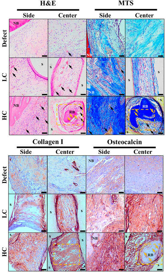 Furthermore, upon closer observation of the yellow dashed area in Figure 8, as magnified from Figure 7, in the HC scaffold group, not only was there more evidence of vascularization compared to other experimental groups, but also evidence of bone cell maturation during the bone regeneration process, such as osteocytes within the regenerated bone and surrounding lining osteoblasts, which were not observed in other experimental groups.