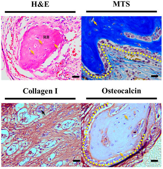 Enlarged histological staining images of HC scaffold center. The scale bar is 20.0 µm (RB: regeneration bone, black arrow: new blood vessels, yellow arrow: new osteocyte, yellow dotted area: lining osteoblast).