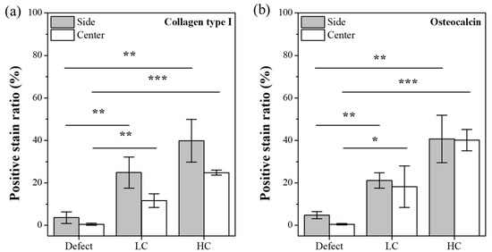 Positive stain ratio for IHC-stained images. (a) Trend graph for collagen type I. (b) Trend graph for osteocalcin protein (* p < 0.05, ** p < 0.01, *** p < 0.001).
