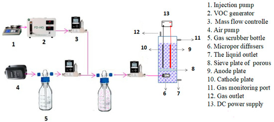 The experimental system, as shown in Figure 1, consisted of four parts: an air pumping system, a VOC generator (FD-PG, Suzhou Furan De Experimental Equipment Co., Ltd., Suzhou, China), an electrolytic cell and a DC power supply. The electrolytic cell is made of plexiglass (height: 300.0 mm, length: 120.0 mm, width: 120.0 mm). The inlet waste gas and microporous aerator device were provided at the bottom of the electrochemical reactor. The middle part of the reactor is dedicated to the electrochemical oxidation; the anode and cathode (effective size was 100 × 80 cm) were placed in parallel on a sieve plate with an adjustable distance, which is connected with the DC power supply (KPS-3005D, Shenzhen Zhaoxin Electronic Instrument Equipment Co., Ltd., Shenzhen, China) by an electrode holder with a conductor. MCB waste gas is produced by an injection pump and VOC generator. The air pump produces air, which dilutes the MCB waste gas. The gas flow rate is regulated by a mass flow controller (GSC-B9SB-BB26, Vögtlin Instruments AG, Aesch, Switzerland). The waste gas flows into the microporous aerator at the bottom, and it is then treated by electrochemical oxidation; untreated waste gas was discharged at the top outlet.